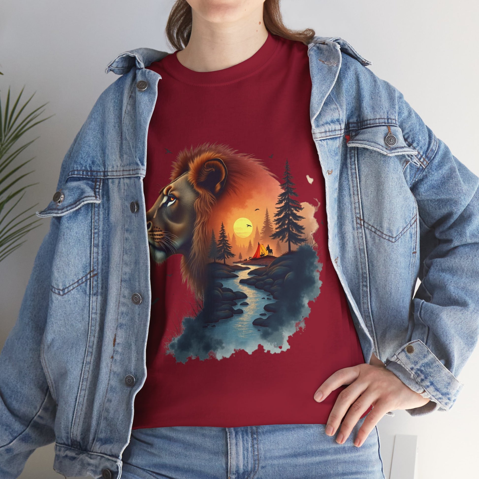 This classic cotton tee carries a quiet, adventurous spirit. A watercolor-style lion silhouette frames a sunset forest and winding river, bringing together wildlife and wanderlust in soft, painterly tones. The front artwork rests on a relaxed, crew-neck silhouette while a small circular emblem sits at the upper back for a subtle, polished finish. Wear it on weekend drives, campfire evenings, or when you want a gentle reminder of nature’s calm strength—comfortable, breathable, and built to last.