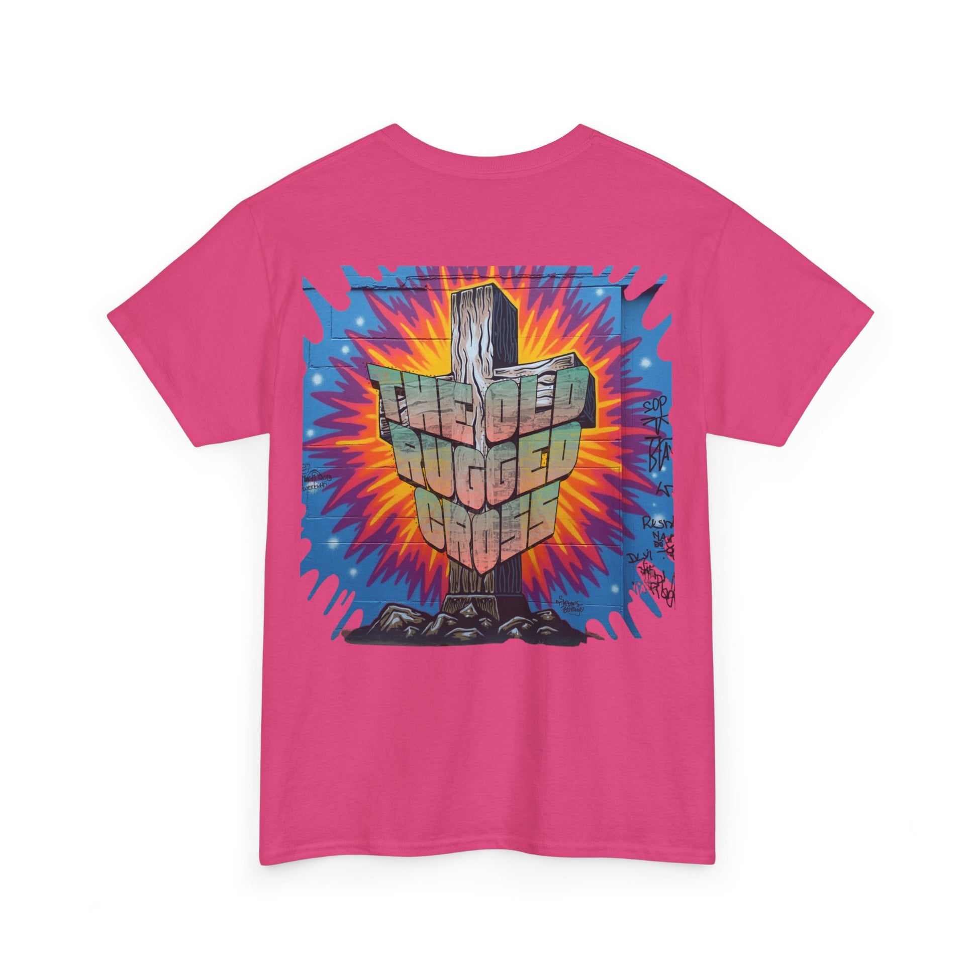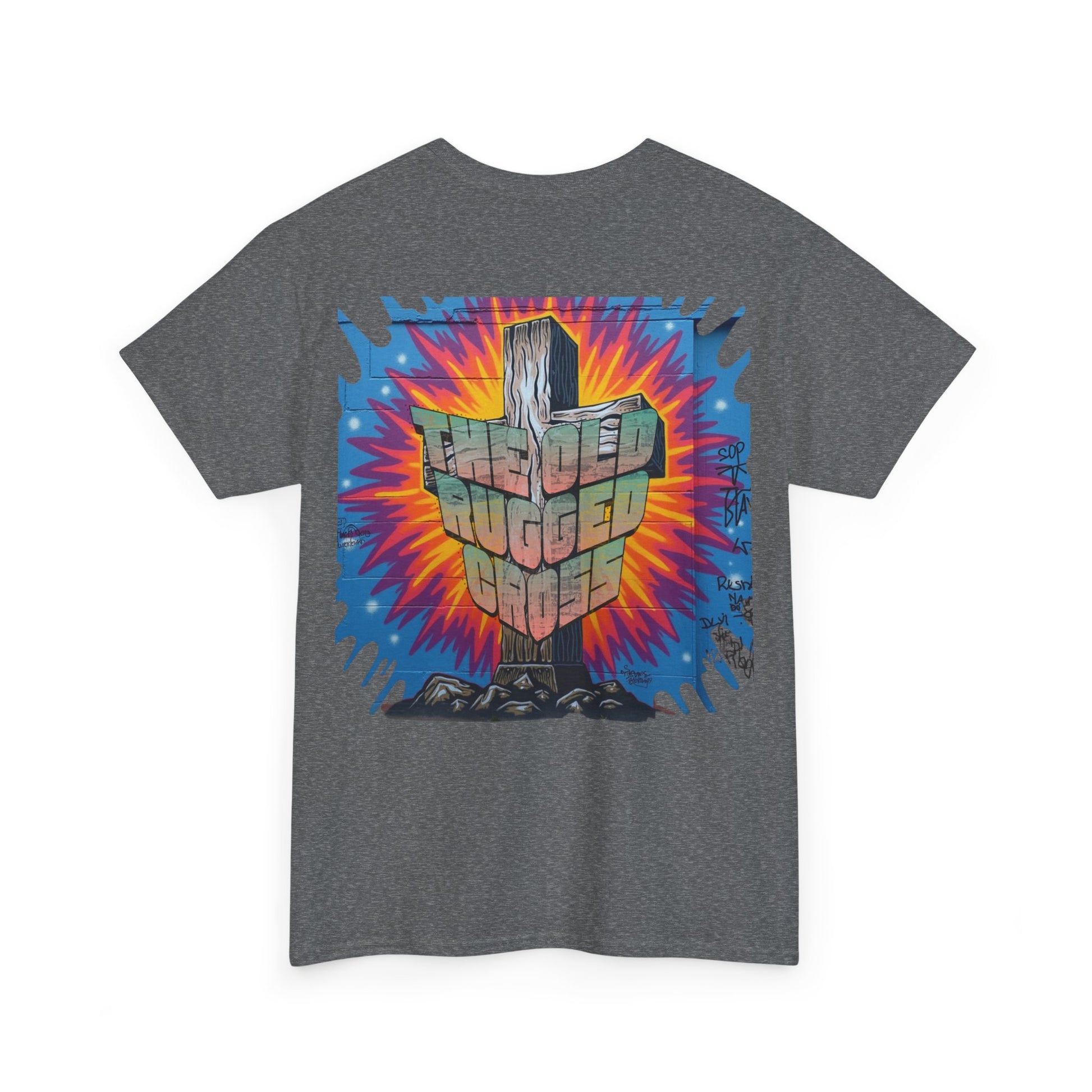 A soft, sturdy cotton tee that wears like a companion for long days and loud nights. The front carries a small, subtle emblem near the chest while the back explodes with a vintage-styled, colorful graphic—bold type carved into a stone cross with radiating, psychedelic color. It feels lived-in from the first wear: breathable medium-weight fabric, a relaxed crew neckline, and a classic cut that layers easily under jackets or stands alone on warm evenings. The flawless print techniques keep colors vivid and edges sharp wash after wash. This shirt settles into the wardrobe of someone who likes music, nostalgia, and art that makes a statement without shouting.